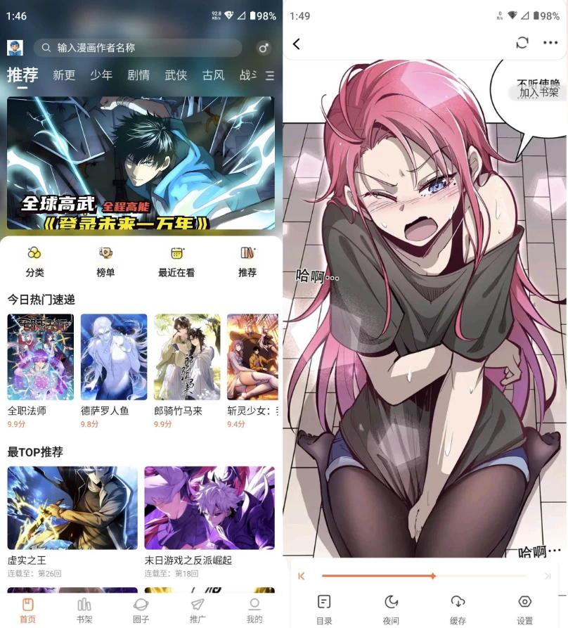 - 实用追漫工具:单章 / 批量离线缓存(断点续传),自定义缓存清晰度(360P-1080P)与存储路径;收藏漫画自动推送更新提醒,热门榜单实时更新,智能推荐同类型作品。