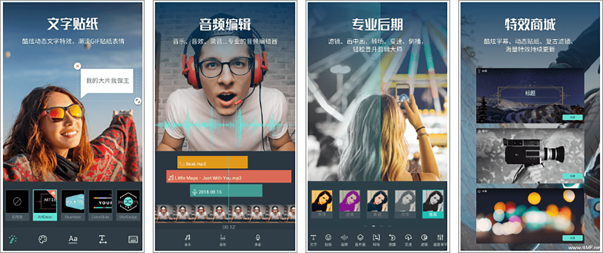 - 解锁全部 Pro 高级特效、滤镜、转场、贴纸、字体与背景音乐库