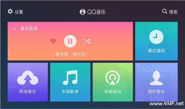 1、在本站下载安装QQ音乐车机版,可以看到当前播放音乐、最近播放、本地音乐、为你推荐、个性电台和我的音乐六大版块。再加上左上方的设置,和右上方的搜索,这样,所有的功能在首页清晰呈现;