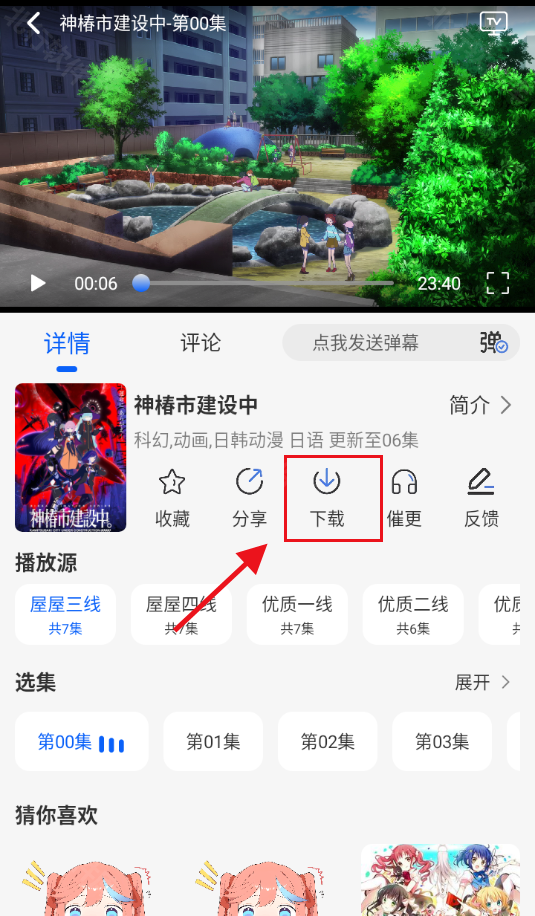 3、点击对应番剧的封面图,可以进入播放详情页,在这里能够选择剧集、播放源,还有收藏、分享、下载等功能