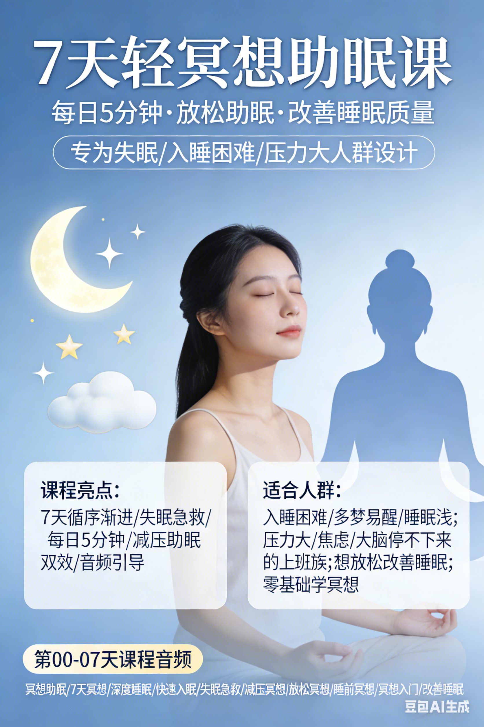 课程定位:每日 5 分钟轻冥想,专为失眠、入睡困难、压力大人群设计,7 天系统训练,放松助眠、改善睡眠质量。