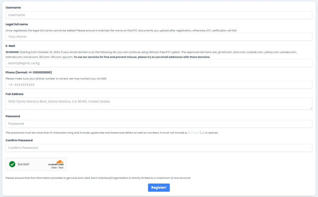 - 输入你要注册的用户名、姓名、邮箱,电话和地址,务必注意格式如上图所示。希望匿名的用户可以通过身份大全网站获取虚拟身份信息。